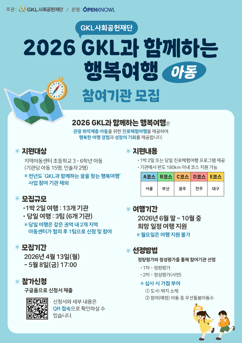 'GKL과 함께하는 행복여행'사업을 운영하고 있으니 지역아동센터의 많은 관심과 신청 바랍니다.